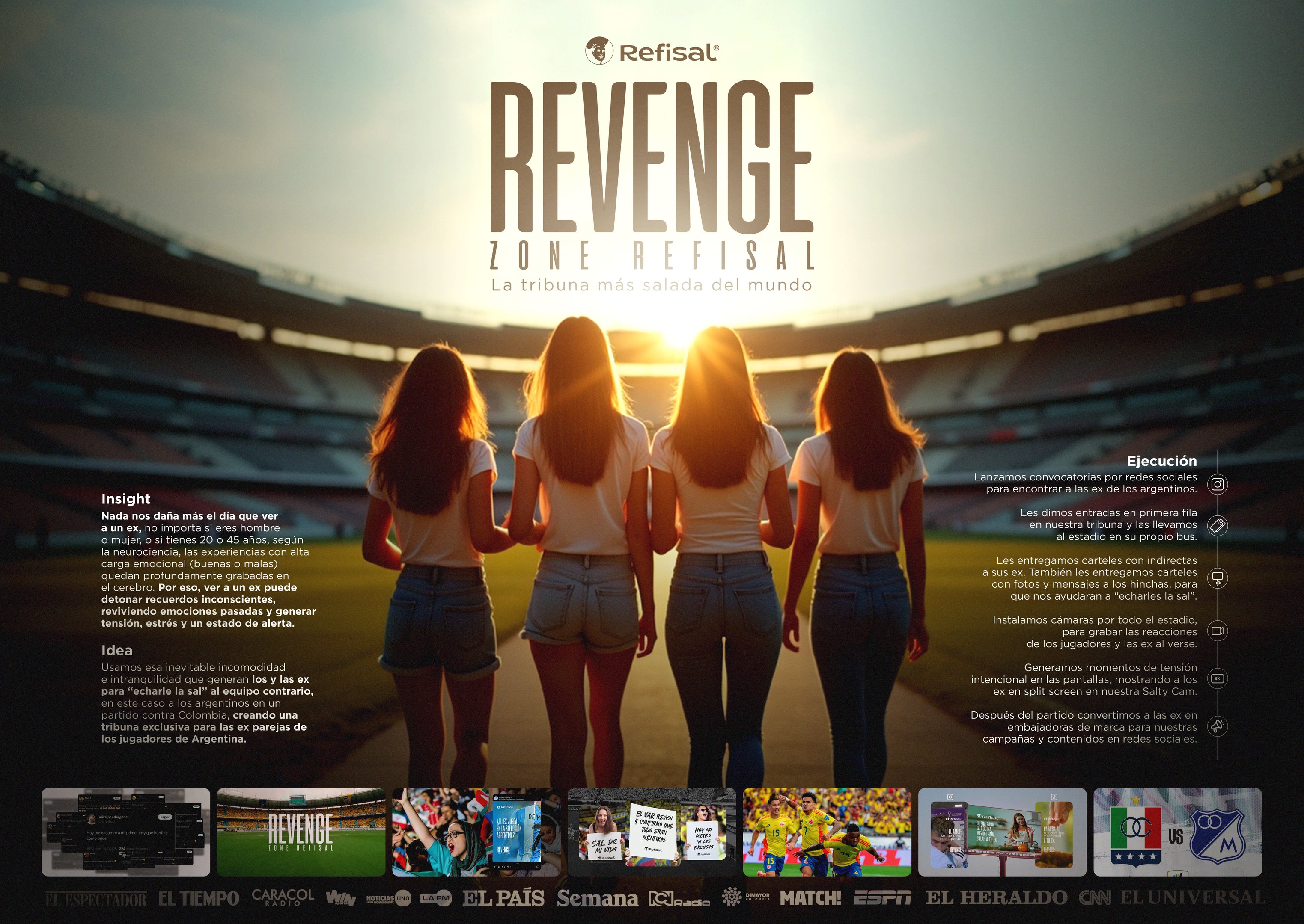 | descripción de la propuesta: | Revenge Zone Refisal La tribuna más salada del mundo Insight Nada nos daña más el día que ver a un ex, no importa si eres hombre o mujer, o si tienes 20 o 45 años, según la neurociencia, las experiencias con alta carga emocional (buenas o malas) quedan profundamente grabadas en el cerebro. Por eso, ver a un ex puede detonar recuerdos inconscientes, reviviendo emociones pasadas y generar tensión, estrés y un estado de alerta. Idea Usamos esa inevitable incomodidad e intranquilidad que generan los y las ex para “echarle la sal” al equipo contrario, en este caso a los argentinos en un partido contra Colombia, creando una tribuna exclusiva para las ex parejas de los jugadores de Argentina. Ejecución Lanzamos convocatorias por redes sociales para encontrar a las ex de los argentinos. Les dimos entradas en primera fila en nuestra tribuna y las llevamos al estadio en su propio bus. Les entregamos carteles con indirectas a sus ex. También les entregamos carteles con fotos y mensajes a los hinchas, para que nos ayudaran a “echarles la sal”. Instalamos cámaras por todo el estadio, para grabar las reacciones de los jugadores y las ex al verse. Generamos momentos de tensión intencional en las pantallas, mostrando a los ex en split screen en nuestra Salty Cam. Después del partido convertimos a las ex en embajadoras de marca para nuestras campañas y contenidos en redes sociales. |